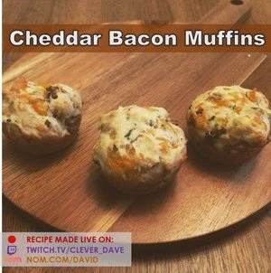 Cook & dice bacon. Add oil to pan and fry mushrooms. Sift flour, baking powder, and salt together. Add cheese & chives. Whisk butter, egg, and milk together and pour into dry ingredients and mix. Fold in bacon and mushrooms. Spoon batter into a greased muffin tray (12 total). Bake for 18 minutes @ 390F (200C).